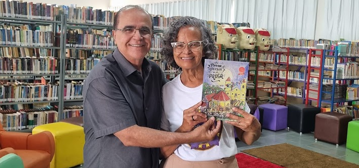 Na Biblioteca Municipal coordenadora Edilamar Arvelos recebeu os livros “Prosa e Poesia na Praça" e “Vento de Dentro” — coletânea de contos infantojuvenis produzidos por alunos da Escola da Serra, em Belo Horizonte