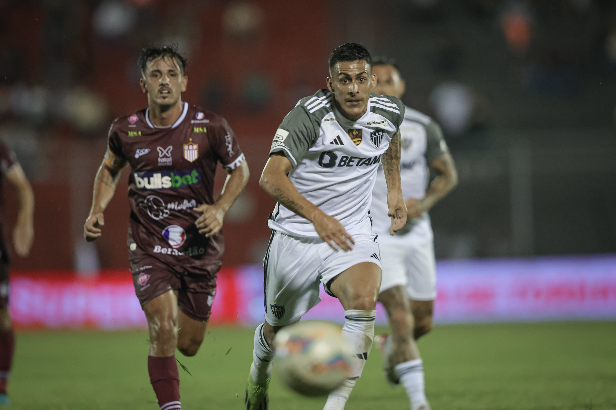 Lance de Patrociense 2 a 1 Atlético, gol de falta de Mauricio Lemos (Galo), Everton e Hudson (CAP), de 2024, ano do rebaixamento do clube. Foto: Atlétcio |Divulgação