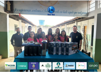 Representantes da cooperativa entregam equipamentos para a inclusão digital de crianças. Foto: Divulgação/Sicoob Coopacredi Doação de 10 máquinas beneficia a…