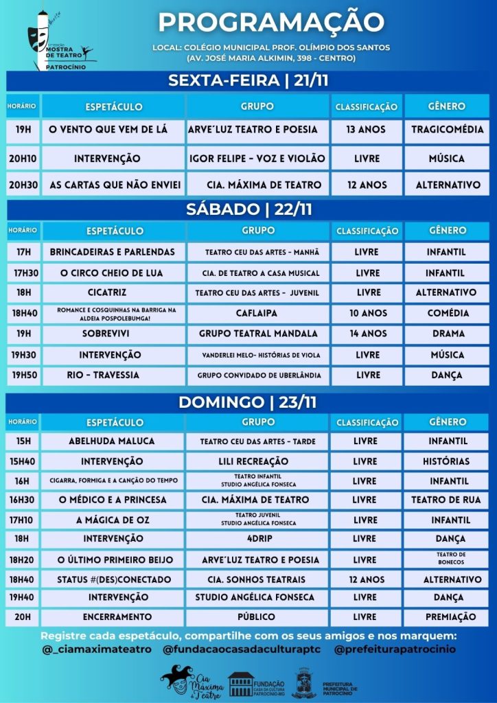 A 11ª Mostra de Teatro de Patrocínio será realizada entre os dias 21 e 23 de novembro, no Colégio Municipal Professor Olímpio dos Santos, reunindo 18 espetáculos de diferentes gêneros e classificações.