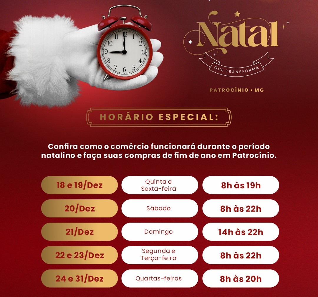 O comércio de Patrocínio registrou dúvidas de lojistas sobre o horário especial de funcionamento no período de Natal e Ano Novo. A Associação Comercial de Patrocínio (ACIP) e a Câmara de Dirigentes Lojistas (CDL), com um atendimento online — e presencial, quando necessário — aos seus associados têm conseguido, de forma rápida e dinâmica, tirar dúvidas sobre o Natal de 2025.