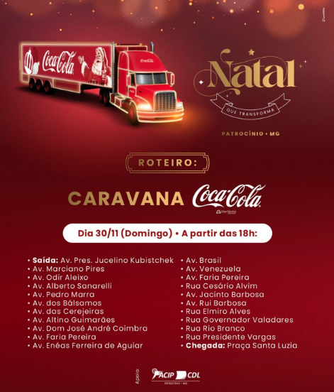 A Campanha Natal que Transforma, promovida pelas ACIP/CDL, receberá a Caravana Coca-Cola no dia 30 de novembro. A programação será realizada no domingo, com saída às 18h no Bairro Belvedere. O trajeto passará por vários bairros da cidade. A chegada ocorrerá na Praça Santa Luzia. As entidades confirmaram o evento no horário previsto.
