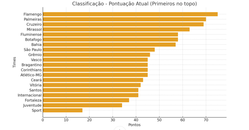 Com os jogos já realizados, Flamengo lidera com 75 pontos, seguido por Palmeiras com 70 e Cruzeiro com 69. Mirassol aparece em quarto com 63, enquanto Fluminense e Botafogo completam o grupo das primeiras posições com 58 pontos cada. A disputa pelo G8 envolve Bahia, São Paulo, Grêmio e Vasco, que seguem próximos na soma final.