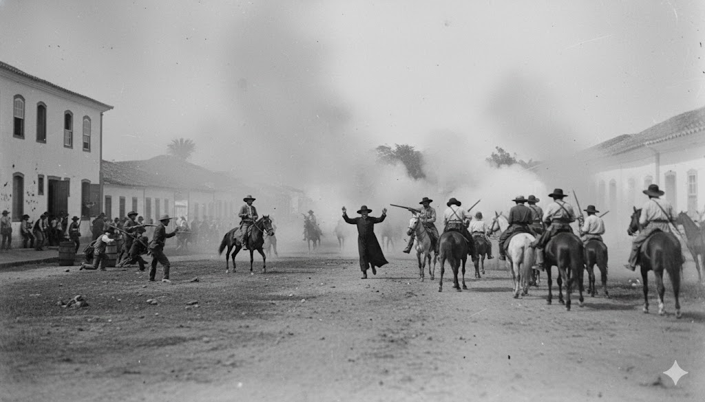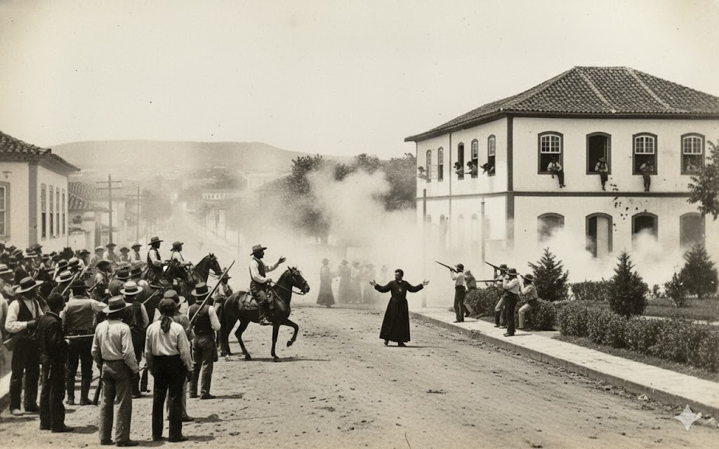 Veio então a faísca. Um disparo — de origem incerta — cortou o silêncio. Outro logo se seguiu. Em instantes, muitos. O Largo do Rosário mergulhou no caos. Paredes da Câmara receberam marcas que durariam décadas. Cavalos relincharam. Homens se escondiam atrás de pilastras, barris e bancos.