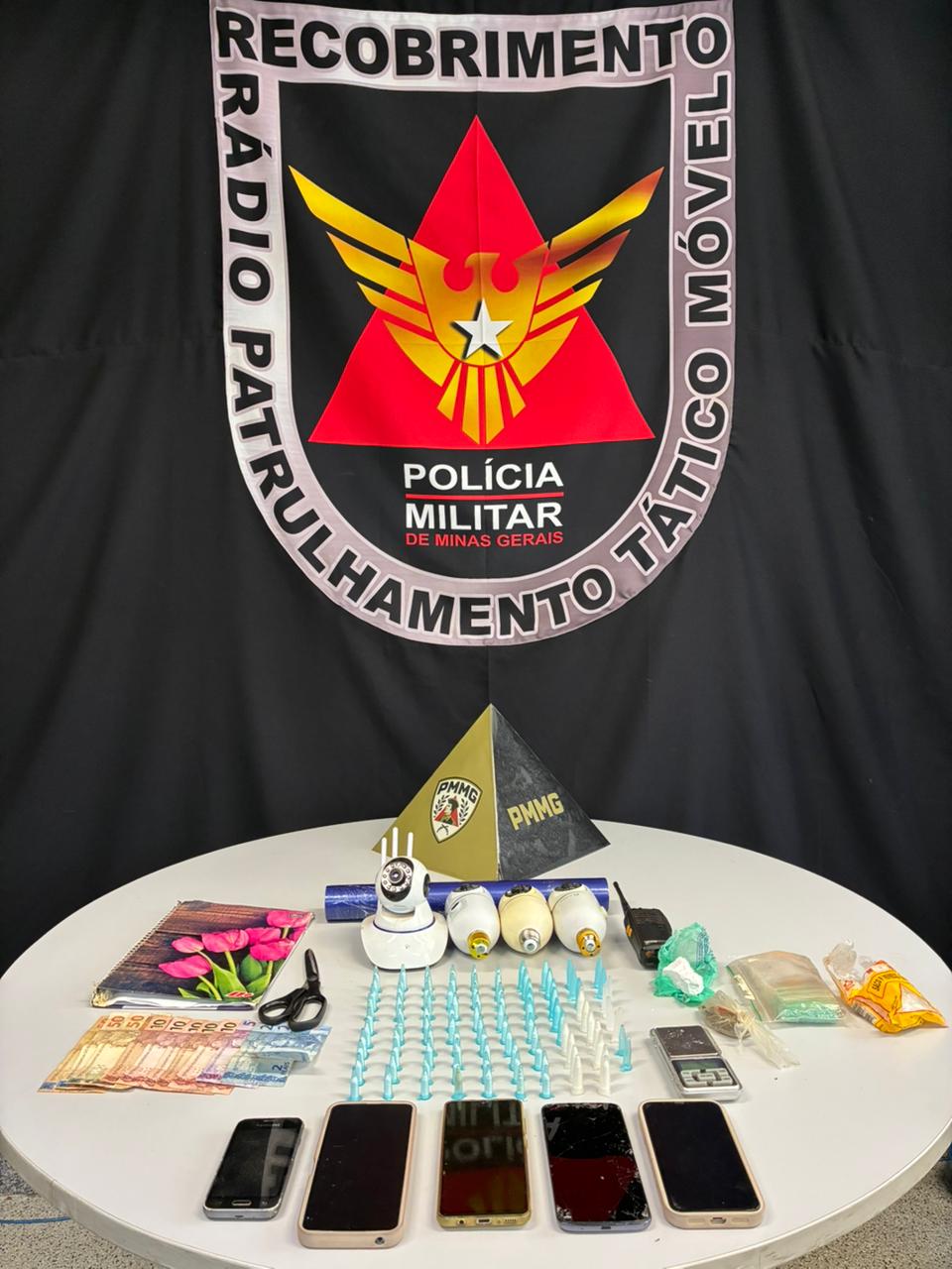 As buscas também resultaram na apreensão de dinheiro, celulares e equipamentos de monitoramento encontrados no endereço. Os militares registraram todos os itens recolhidos de acordo com os procedimentos previstos. A verificação dos materiais ficou a cargo da equipe responsável pela coleta e catalogação dos objetos, que foram listados para conferência e encaminhamento. As informações reunidas serão analisadas durante a continuidade das investigações conduzidas pela Polícia Civil.