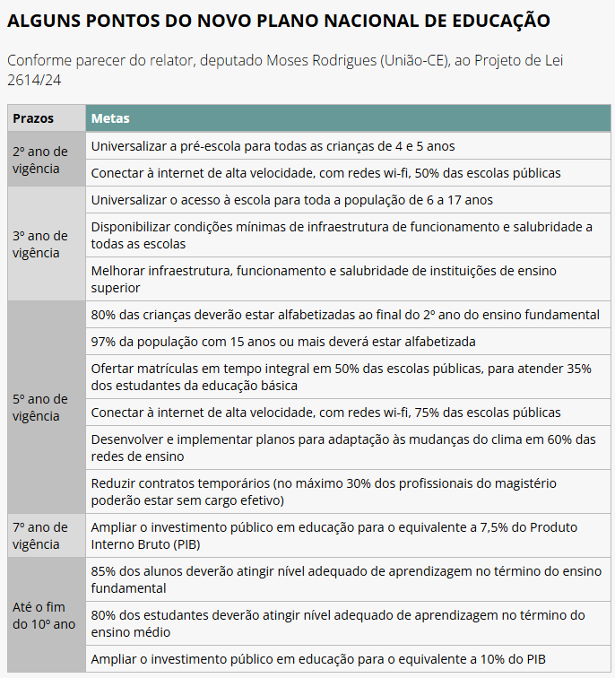 O relator Moses Rodrigues afirmou que o novo PNE consegue conciliar a ousadia necessária nas metas propostas com a viabilidade de execução orçamentária. Um dos pontos chave do texto é a ampliação do investimento público em educação, estabelecendo um aumento progressivo. A proposta prevê que os investimentos cheguem a 7,5% do Produto Interno Bruto (PIB) no prazo de sete anos de vigência do plano.
