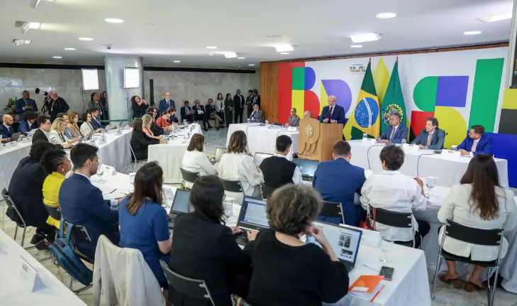 Na manhã desta quinta-feira, Lula recebeu jornalistas para um café da manhã, no Palácio do Planalto, seguido de coletiva de imprensa. Ele está acompanhado dos ministros da Fazenda, Fernando Haddad; da Casa Civil, Rui Costa; das Relações Exteriores, Mauro Vieira; e do Meio Ambiente e Mudança do Clima, Marina Silva.