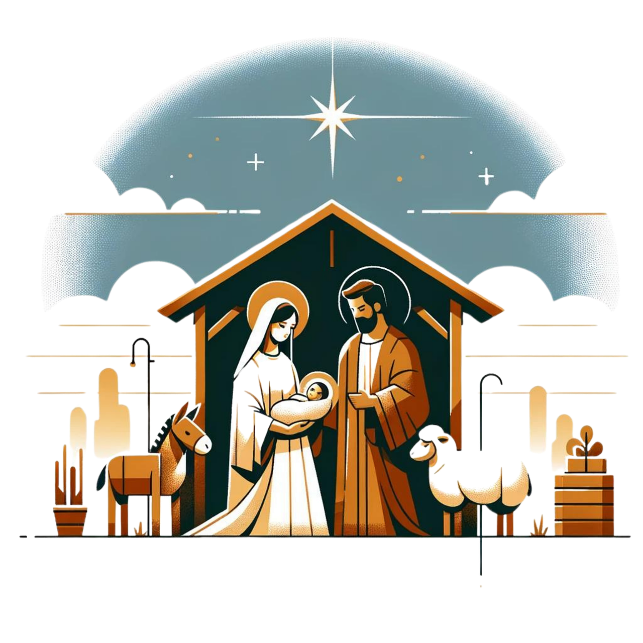Fixa na retina aquela sagrada família: Jesus bebê, José e mãe Maria.