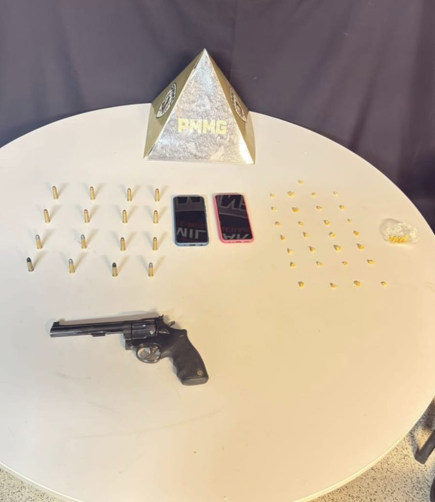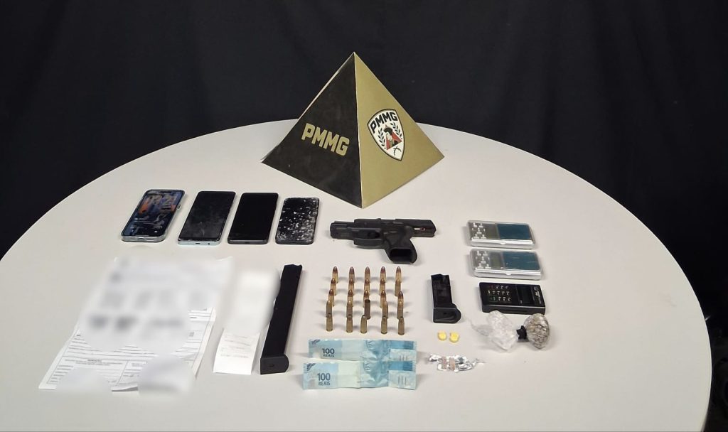 Questionado, o suspeito informou que havia guardado arma de fogo e drogas para outro envolvido, indicando o endereço onde o material estaria escondido. No local indicado, acompanhado por familiares, os militares localizaram uma pistola calibre 9mm com carregador alongado, munições, balanças de precisão, máquina de cartão, drogas e aparelhos celulares. Também foi apreendido um veículo por irregularidade administrativa. Todo o material foi recolhido.