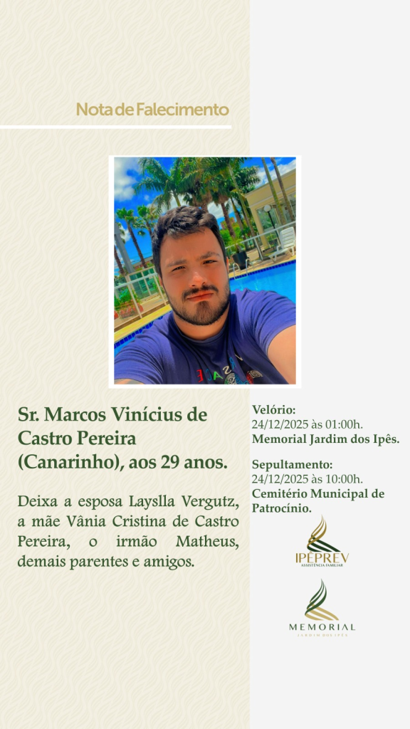 O velório será realizado nesta terça-feira, 24 de dezembro de 2025, a partir da 1h, no Memorial Jardim dos Ipês, em Patrocínio.