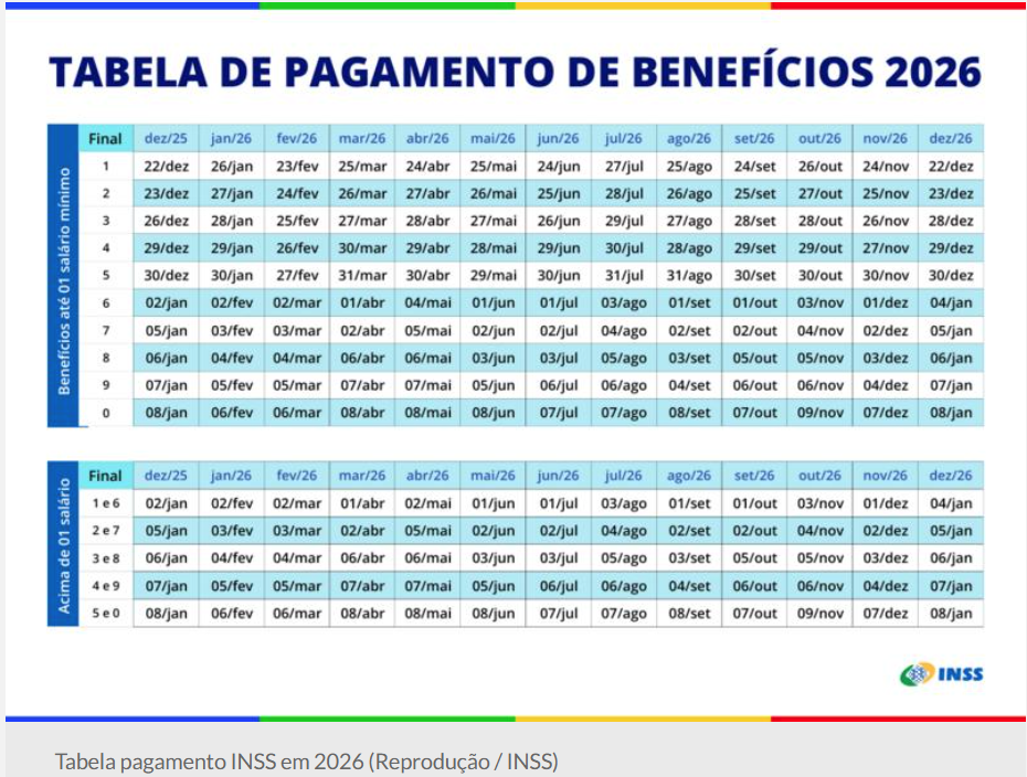 O Instituto Nacional do Seguro Social oficializou o cronograma de pagamentos para o ano de 2026. O anúncio permite que aposentados, pensionistas e demais beneficiários planejem o recebimento de seus recursos mensais. As datas foram definidas com base no número final do cartão de benefício de cada segurado. O órgão mantém a divisão entre quem recebe um salário mínimo e rendas superiores. A divulgação ocorreu por meio dos canais oficiais de comunicação da autarquia federal.