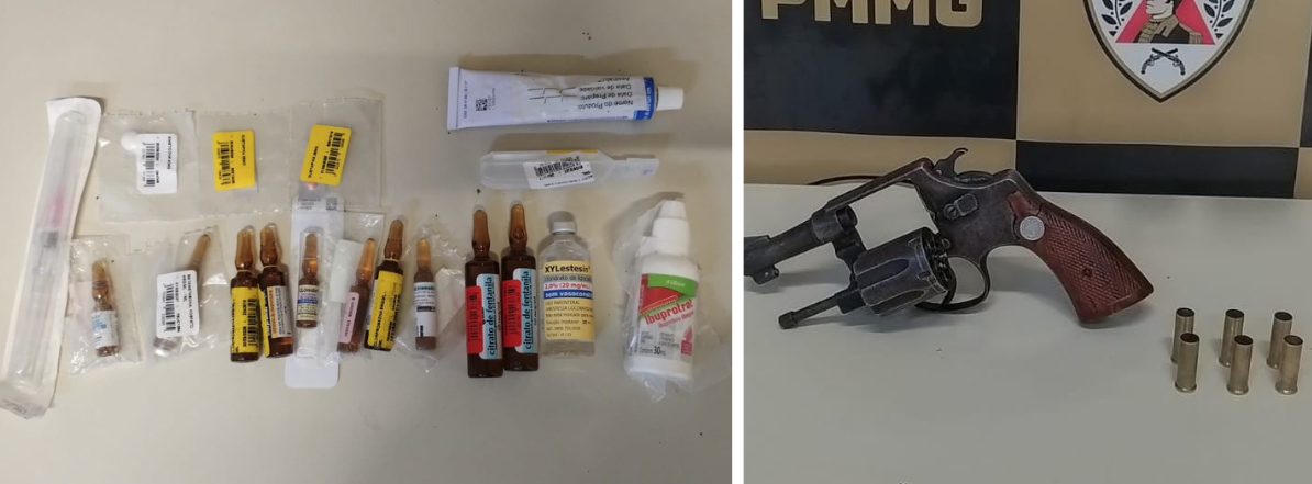 Durante as buscas, os militares apreenderam um revólver calibre .38 utilizado no confronto, contendo seis estojos de munição já deflagrados. Além do armamento, a equipe policial encontrou uma quantidade significativa de medicamentos de uso controlado e substâncias anestésicas. A origem desses materiais foi investigada e classificada como ilícita após a constatação de falta de prescrição ou notas fiscais. Os itens estavam em posse dos suspeitos no momento da abordagem realizada pelas equipes de serviço.