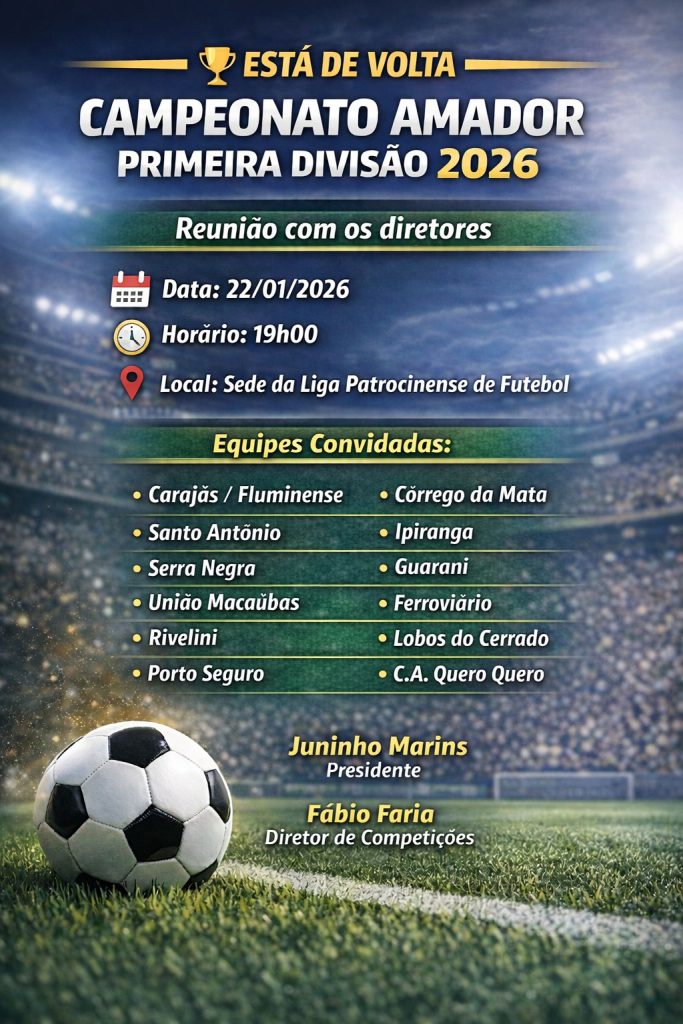 A Liga Patrocinense de Futebol agendou a primeira reunião oficial para tratar do Campeonato Amador da Primeira Divisão de 2026. O encontro entre a diretoria da entidade e os representantes dos clubes está marcado para o dia 22 de janeiro. A reunião ocorrerá às 19h, tendo como local a sede própria da Liga em Patrocínio. Este evento marca o planejamento inicial para o retorno da principal competição do futebol amador local. O presidente Juninho Marins e o diretor Fábio Faria coordenarão os trabalhos técnicos do encontro.