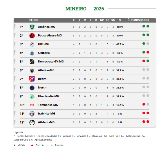 O North somou seu primeiro ponto na elite do Mineiro diante de sua torcida. A equipe manteve organização defensiva em boa parte do confronto. O resultado foi celebrado pelo time de Montes Claros. O campeonato segue com sequência de jogos ao longo da semana. As posições do grupo ainda podem sofrer alterações nas próximas rodadas.