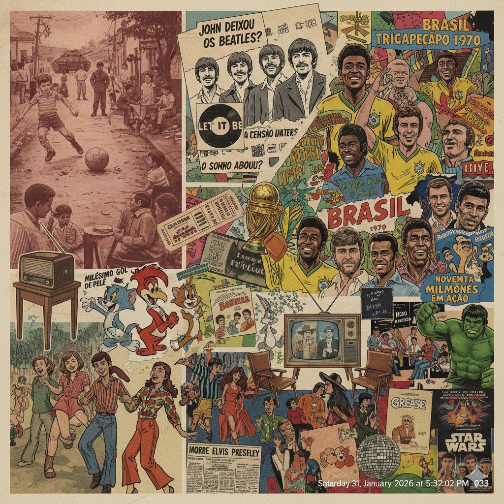 Aqui, a tristeza pelo fim dos Beatles foi rapidamente substituída por uma alegria barulhenta e coletiva chamada Copa do Mundo. O futebol ocupava tudo. A Seleção Brasileira de 1970 não jogava, encantava. Gerson, Rivellino, Jairzinho, Tostão e Pelé pareciam personagens de uma história em quadrinhos, desses que não perdem nunca. No dia 21 de junho, o Brasil foi tricampeão no México, e a sensação era de que o país inteiro tinha vencido junto, mesmo sem entender direito o que acontecia fora das quatro linhas.