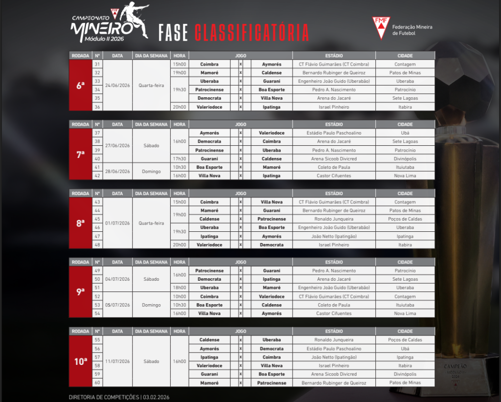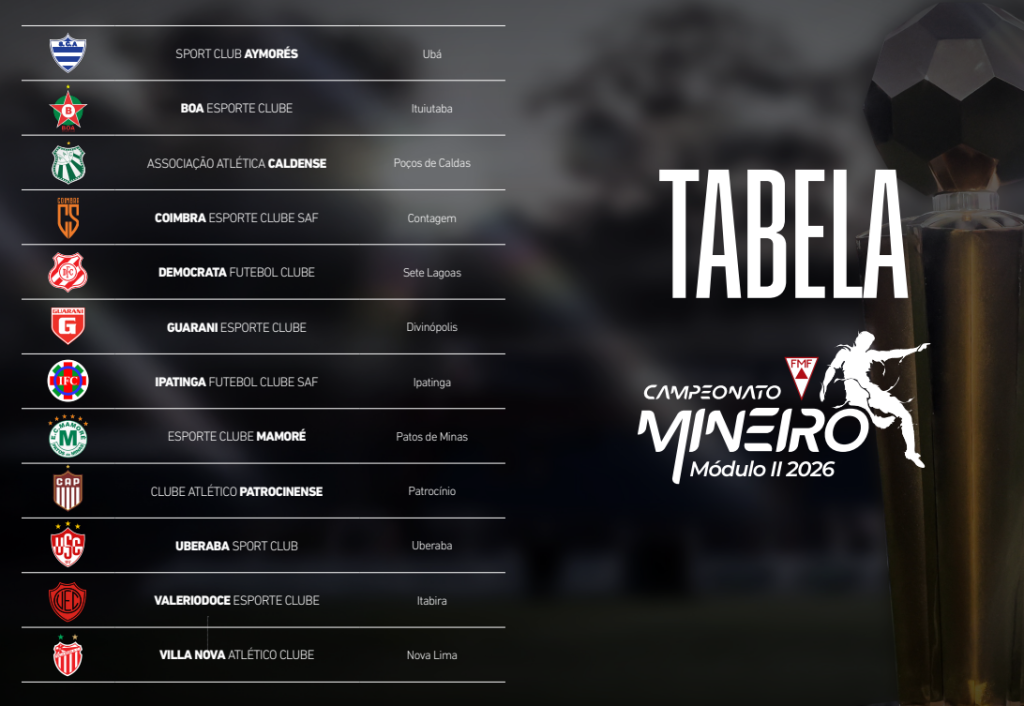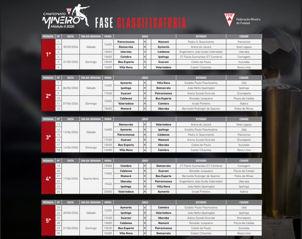 A Federação Mineira de Futebol divulgou a tabela da primeira fase do Campeonato Mineiro Módulo II de 2026, com início previsto para o dia 30/05/2026. O Patrocinense fará a estreia em casa, no Estádio Pedro Alves do Nascimento, diante do Mamoré de Patos de Minas. A partida está marcada para um sábado, às 16h00. O confronto abre a participação do clube na competição estadual. A primeira fase será disputada em sistema de pontos corridos.