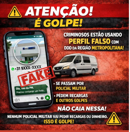 A Polícia Militar informou que não solicita, por telefone ou aplicativos, compras, pagamentos ou recargas. A orientação é para que, em caso de contato suspeito, não seja realizado pagamento e a ocorrência seja comunicada imediatamente pelo telefone 190 para verificação.