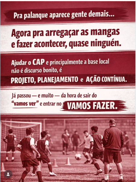 Não estamos pedindo que ninguém tire dinheiro de onde não pode. O que esperamos é comprometimento com a palavra dada e com a história do CAP. Que utilizem sua influência, seus contatos e sua capacidade de articulação para buscar recursos, parcerias e patrocinadores. O CAP é patrimônio da nossa cidade. É história, é tradição, é identidade. Pedimos que não abandonem o clube neste momento decisivo. É hora de bater no peito, erguer a cabeça e transformar discurso em ação.