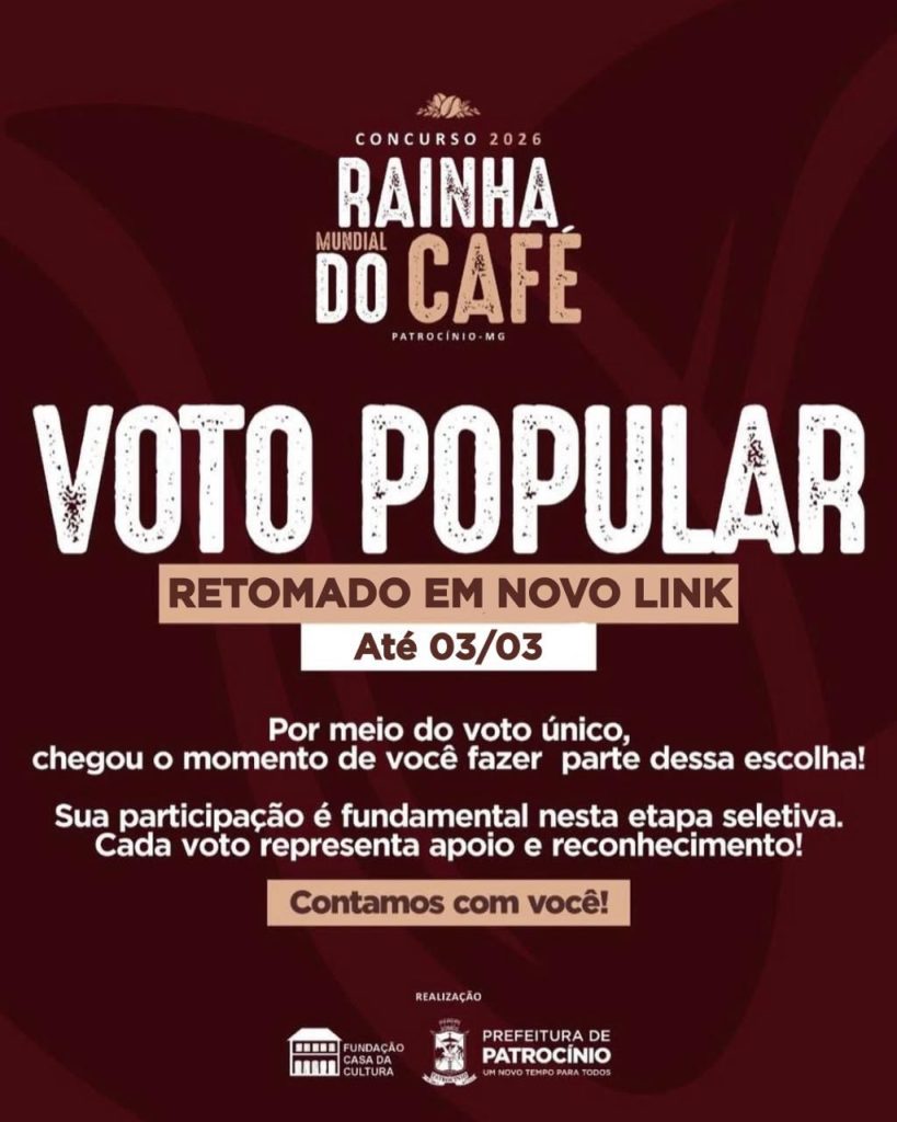 Já está disponível em novo formato a retomada da votação popular do Concurso Rainha Mundial do Café. O acesso ocorre por meio de link oficial disponibilizado pela Comissão Organizadora. O processo passa a ser realizado exclusivamente pelo site oficial do concurso. A medida, segundo a organização, garante mais segurança ao sistema. A votação permanece aberta ao público conforme regulamento.