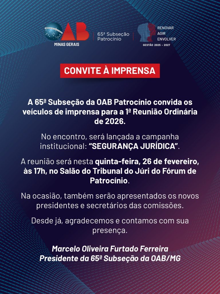A 65ª Subseção da OAB Patrocínio realiza a sua 1ª Reunião Ordinária de 2026 nesta quinta-feira, 26 de fevereiro. O evento acontece às 17h no Salão do Tribunal do Júri do Fórum da comarca local. Durante o encontro será feito o lançamento oficial da campanha institucional intitulada Segurança Jurídica para a comunidade. O presidente da subseção, Marcelo Oliveira Furtado Ferreira, convidou os veículos de imprensa para acompanhar as diretrizes. A iniciativa busca fortalecer a imagem da instituição e o papel fundamental da advocacia perante a sociedade.