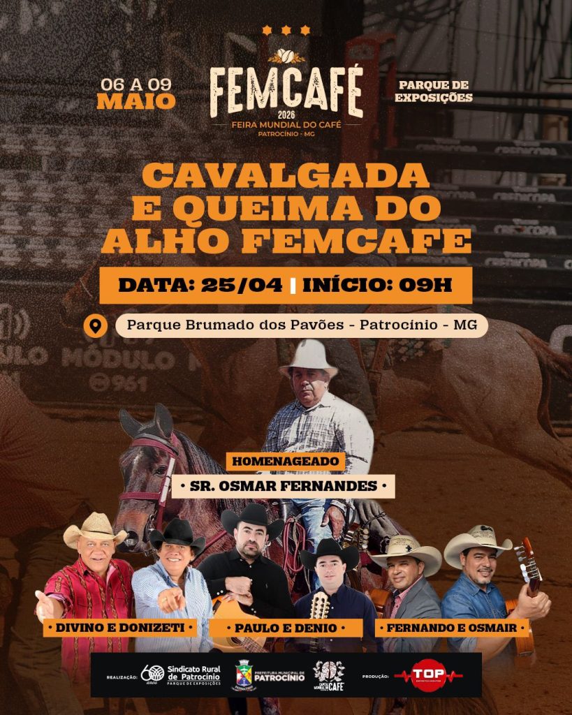 A Cavalgada e a Queima do Alho são realizadas pelo Sindicato Rural de Patrocínio. O evento conta com parceria da Prefeitura Municipal. A produção e a estrutura das atividades são de responsabilidade da empresa Top Entretenimentos. As ações integram a programação oficial da FemCafé 2026 no município.