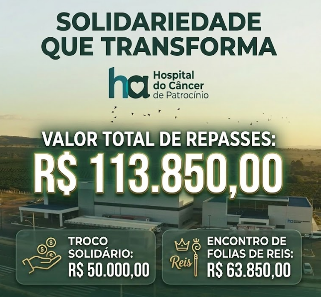 Duas mobilizações solidárias recentes resultaram no repasse de 113.850 reais para o Hospital do Câncer de Patrocínio. A primeira iniciativa denominada Troco Solidário contou com a parceria da Planetur Turismo e de supermercados locais durante o ano de 2025. O projeto incentivou clientes a doarem frações de valores de compras para a instituição de saúde. Os recursos financeiros obtidos nesta modalidade somam 50.000 reais desde o início das edições. A meta da campanha é garantir suporte contínuo ao atendimento dos pacientes e auxílio nas edificações.