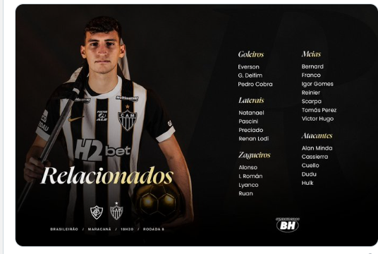 Entre os relacionados estão os goleiros Everson, Gabriel Delfim e Pedro Cobra, os zagueiros Junior Alonso, Lyanco, Ivan Román e Vitor Hugo, além de laterais, meio-campistas e atacantes que completam o grupo convocado para a partida fora de casa.