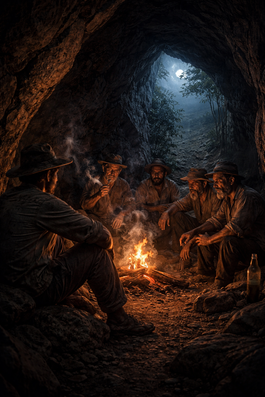 Lá dentro da fenda estreita de quartzito, com a boca virada pro vale, Zé Pequeno, Zé João e Eurípedes — que todo mundo chamava de Oripe — mais uns três sujeitos acendiam fogo de lenha seca no fundo da gruta. As chamas tremiam e jogavam sombras danadas nas paredes ásperas. O vento entrava uivando, feito alma penada.
