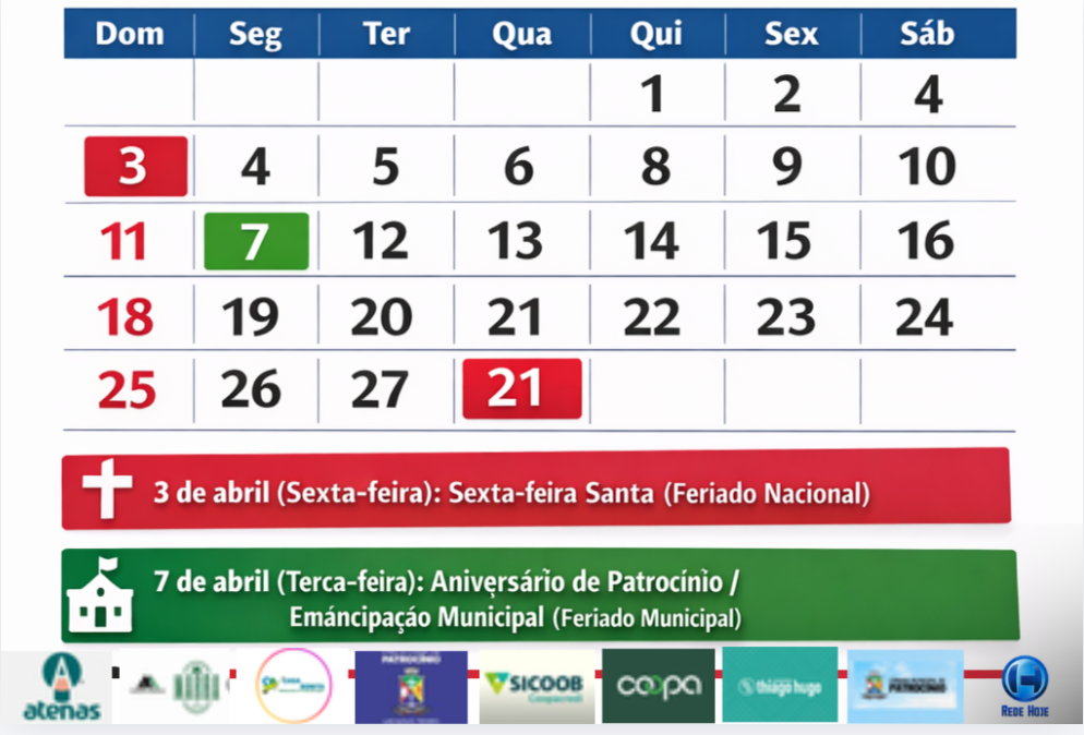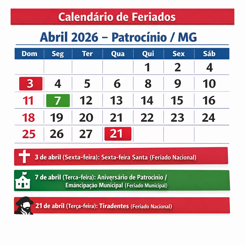 Patrocínio – A paralisação dos serviços públicos municipais ocorre nesta sexta-feira (3 de abril), feriado da Sexta-feira Santa, e se estende até a terça-feira (7), quando é comemorado o aniversário do município. Assim como no período de carnaval, a segunda-feira (6) será dia normal de trabalho. Ainda assim, parte da população costuma prolongar o descanso, retomando as atividades apenas na quarta-feira (8). A suspensão é determinada pela Prefeitura de Patrocínio.