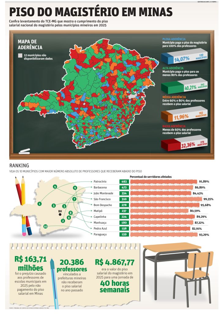 Reportagem assinada pela jornalista Clarisse Souza, do jornal O Tempo, apresenta levantamento do Tribunal de Contas do Estado de Minas Gerais indicando que o piso nacional do magistério, instituído há quase 18 anos, é cumprido integralmente por 14% das 853 prefeituras do estado, ao mesmo tempo em que a Prefeitura de Patrocínio contesta a forma de análise dos dados e afirma que a remuneração local atende aos critérios legais quando considerada a proporcionalidade da jornada, configurando um cenário em que os números apresentados pelo órgão de controle e a interpretação do município seguem parâmetros distintos de cálculo e leitura das informações relacionadas aos vencimentos dos profissionais da educação básica no ano de 2025.