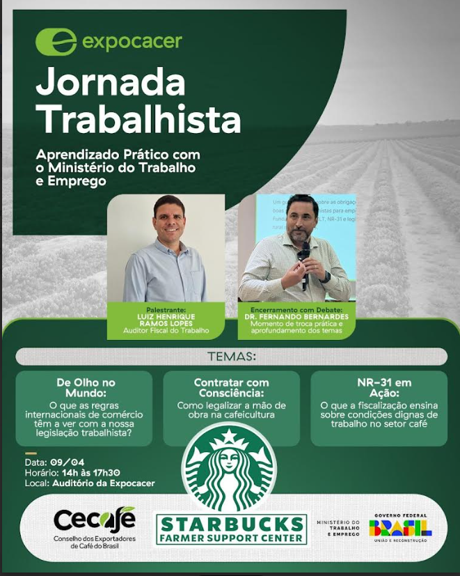 A iniciativa é promovida em parceria com o Cecafé e a Starbucks, contando também com a participação do Ministério do Trabalho e Emprego, com atuação voltada à orientação e acompanhamento das relações de trabalho no campo. Até o momento, estão previstos 3 encontros dentro da programação, sendo o primeiro realizado no dia 18/03/2026, conduzido pelo advogado Fernando Bernardes, que abordou aspectos da legislação trabalhista aplicada ao setor agrícola, com foco na contratação temporária e nas obrigações legais dos produtores.