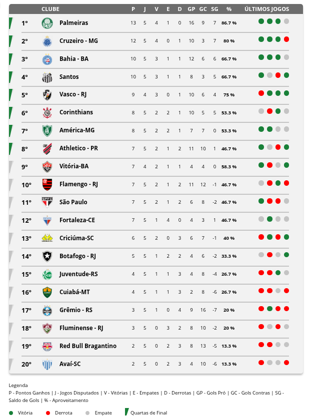 Com a vitória, o Cruzeiro chegou a 12 pontos, resultado de 4 vitórias e 1 derrota em 5 jogos. A liderança, no entanto, ainda depende dos resultados de Palmeiras e Vasco no complemento da 5ª rodada. A equipe comandada pelo técnico Mairon César tem mantido regularidade na competição nacional.