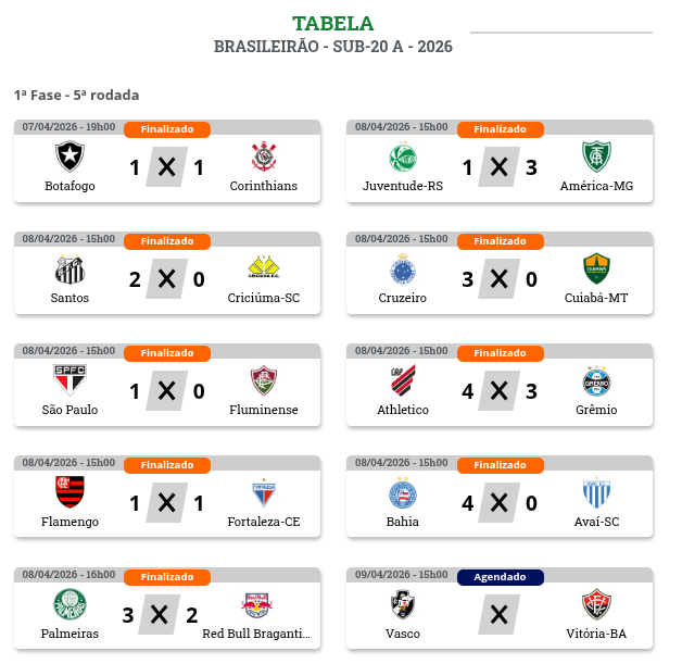 O próximo compromisso do Cruzeiro sub-20 será no sábado (11), às 15h, contra o América, no CT Lanna Drumond, pelo Campeonato Mineiro da categoria. Pelo Brasileirão Sub-20, os Crias da Toca voltam a campo na terça-feira (14), contra o Red Bull Bragantino, fora de casa. A equipe busca manter a liderança e ampliar a sequência positiva.