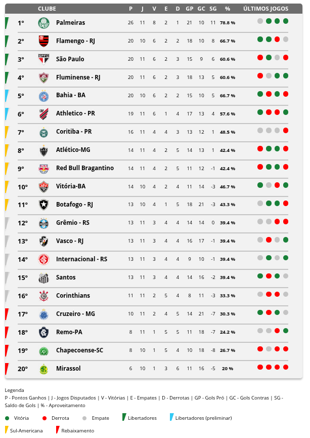 Classificação depois da 11ª rodada do Campeonato Brasileiro