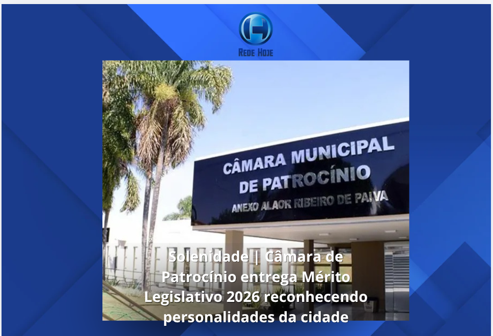 A Câmara Municipal de Patrocínio realiza na próxima terça-feira, dia 14 de abril de 2026, às 19 horas, sessão solene para entrega do Diploma e da Medalha do Mérito Legislativo. O evento acontece no Plenário da Casa de Leis e homenageia cidadãos que prestaram relevantes serviços ao desenvolvimento e ao bem-estar da comunidade patrocinense. A solenidade será presidida pelo vereador Níkolas de Queiroz Elias.