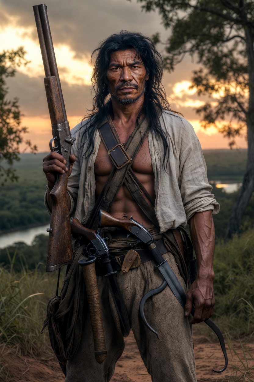 ARMADO DOS PÉS À CABEÇA – Forte e armado. Assim, descreveu o famoso escritor. Da raça de mestiços, viveu nômade, subsistindo quase de caça e pesca. Afonso tinha estatura colossal e de organização atlética. Guimarães: “… de ordinário anda só, mas sempre armado, desde os pés até a cabeça, com excelentes armas, de que sabe usar com incrível destreza. Além de sua espingarda, de dois canos, que nunca lhe sai do punho, traz ao cinto duas pistolas de dois tiros, uma formidável garrucha, a indispensável faca e uma pequena foice. Desta maneira, ele só com uma sua valentia vale por vinte; é como um fortim ambulante”. Se Bernardo Guimarães assim descreveu Afonso, muito provavelmente viu algo semelhante à margem do Rio Paranaíba, que escreveu como “Rio Parnaíba”.