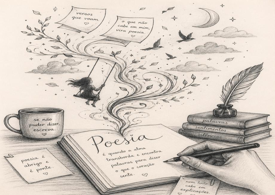 Há também uma liberdade única nela. Diferente de outros tipos de escrita, a poesia não exige regras rígidas. Pode ser curta ou longa, rimada ou não, clara ou cheia de mistério. Ela permite errar, experimentar, quebrar estruturas, e isso, por si só, já é libertador.