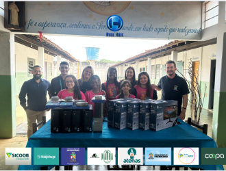 Representantes da cooperativa entregam equipamentos para a inclusão digital de crianças. Foto: Divulgação/Sicoob Coopacredi Doação…