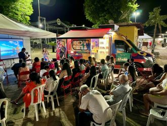 MovCEU estacionado em praça pública oferecendo serviços e oficinas culturais. Foto: Divulgação GOVERNO NA RUA…