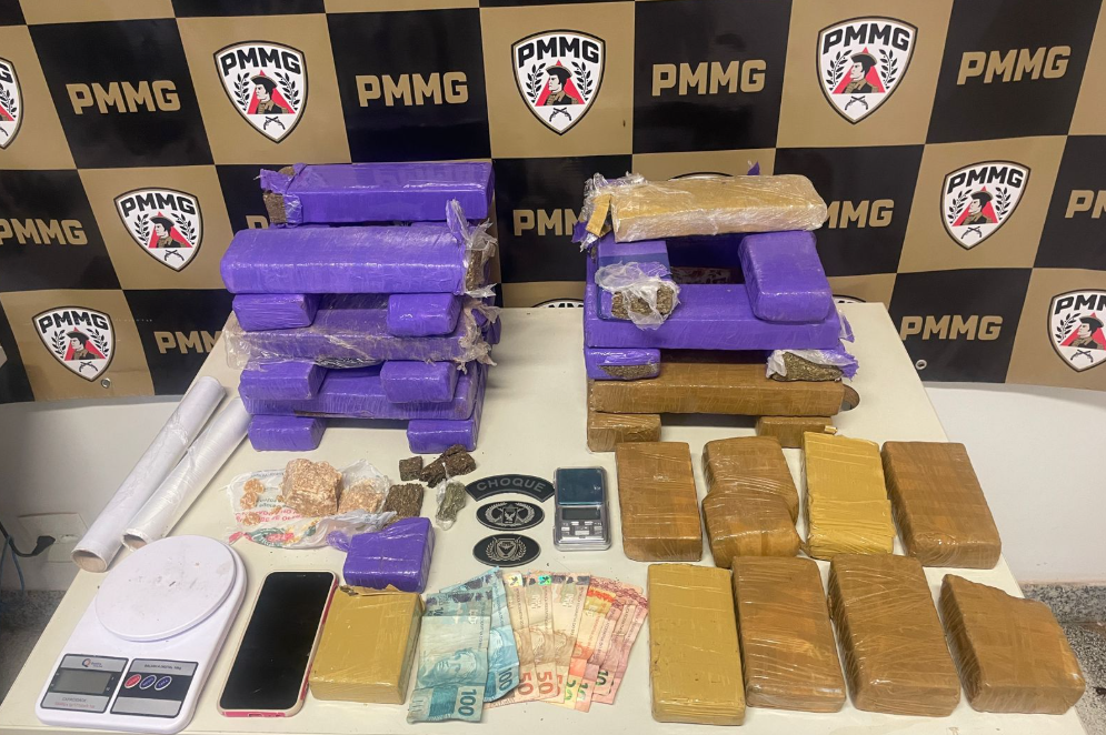 O inventário registrou a apreensão de um grande volume de Cannabis sativa, totalizando 33 barras da substância, contabilizadas 23 barras de tamanho grande, oito de tamanho médio e duas menores, indicando armazenamento em massa. Fotos: 46BPMMG