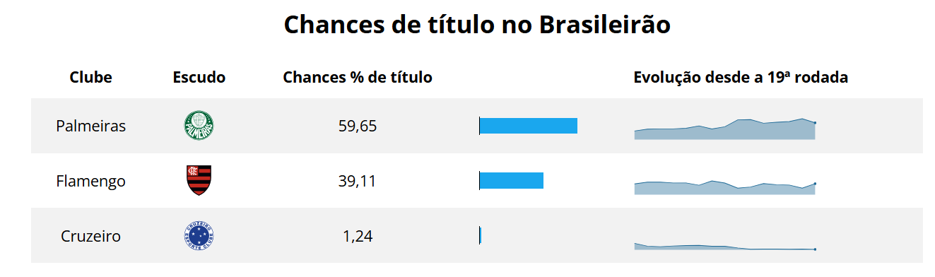 O Cruzeiro desperdiçou a oportunidade de se aproximar da liderança ao empatar em 0 a 0 com o Fluminense, no Mineirão. Com isso, a equipe mineira segue quatro pontos atrás dos líderes e viu suas chances de título reduzirem de 2,33% para 1,24%. A Raposa ainda tem um jogo a mais que Palmeiras e Flamengo.