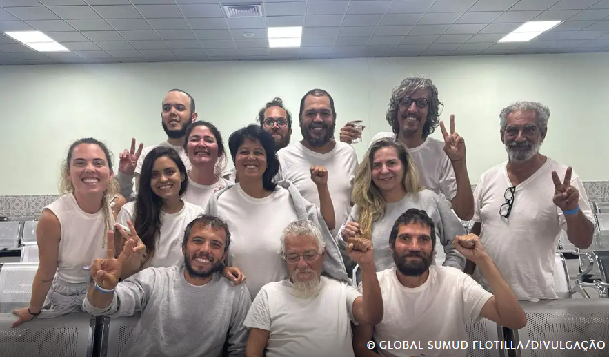 Brasileiros da Flotilha Sumud são libertados e levados para a JordâniaO Ministério das Relações Exteriores (MRE) confirmou nesta terça-feira (7) a libertação dos 13 brasileiros que integravam a Flotilha Global Sumud, incluindo a deputada federal Luizianne Lins (PT-CE). Os ativistas, que estavam detidos pelas autoridades israelenses desde o início de outubro após tentarem levar ajuda humanitária a Gaza, foram conduzidos até a fronteira com a Jordânia. De acordo com o Itamaraty, diplomatas das embaixadas em Tel Aviv e Amã receberam o grupo, que agora está sendo transportado para a capital jordaniana em um veículo da embaixada brasileira. A liberação ocorre no mesmo dia em que se completam dois anos do início da escalada de violência na guerra em Gaza. O MRE havia considerado a interceptação das embarcações em águas internacionais como um ato ilegal e arbitrário.