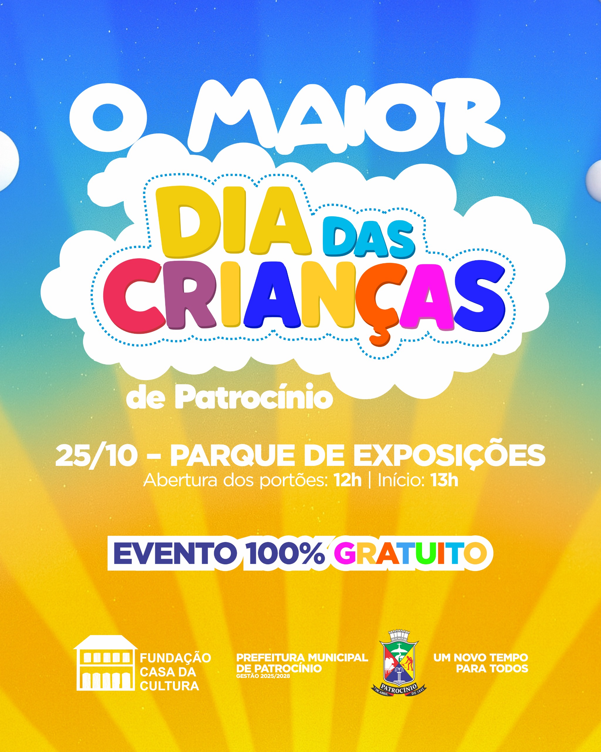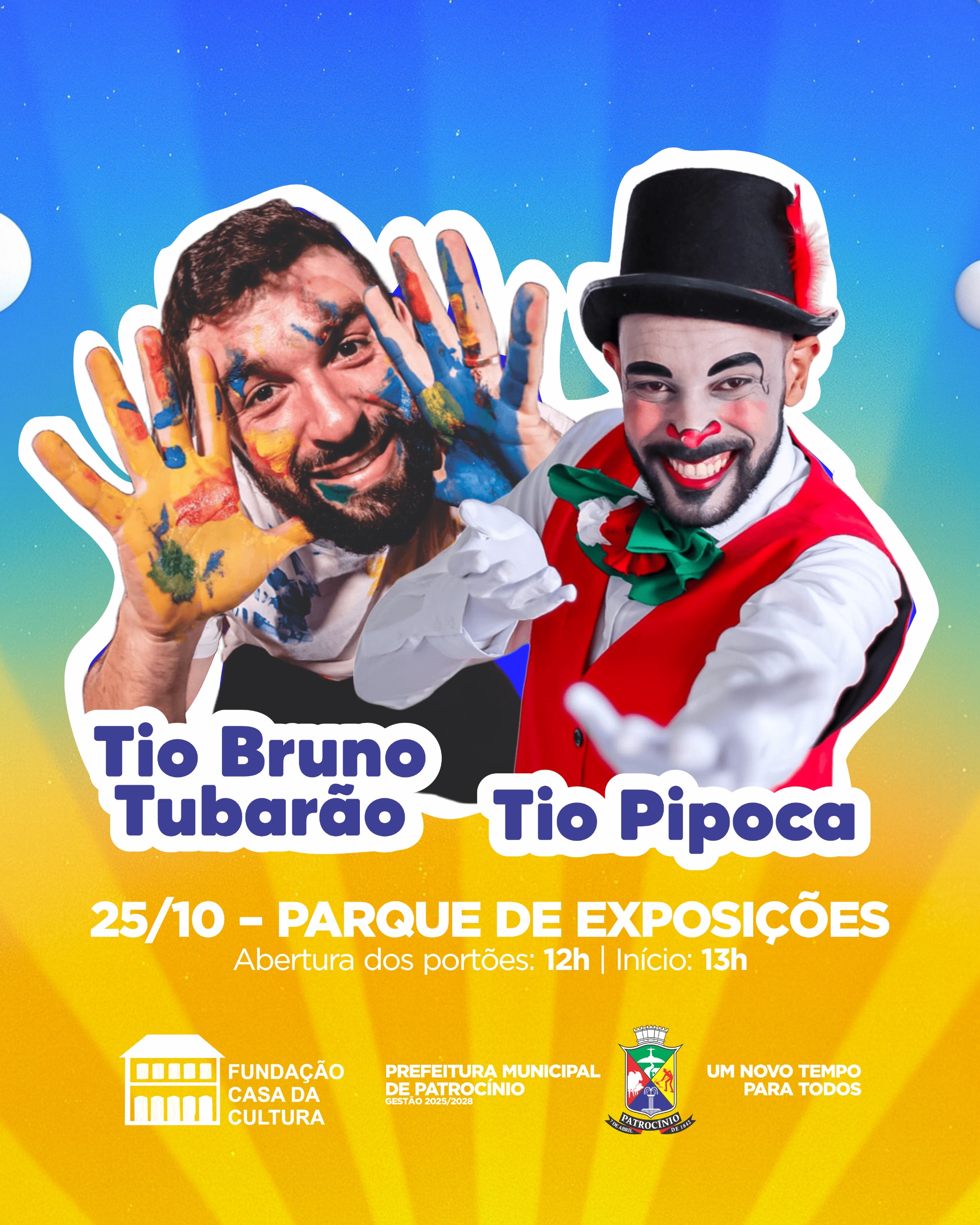 Patati Patatá. Estão confirmadas as presenças do Tio Bruno Tubarão e do Tio Pipoca, que prometem envolver a plateia com números de música e intensa interação. Esses shows servem como aquecimento para a atração principal, ajudando a criar o clima de festa e alegria que o Dia das Crianças merece. O palco estará pronto para receber as diversas apresentações ao longo do evento. O grande destaque da celebração fica por conta da participação da dupla Patati Patatá (Os Originais). Os palhaços trarão para Patrocínio o seu espetáculo cheio de encanto e magia, conhecido nacionalmente por divertir e emocionar crianças de todas as idades.