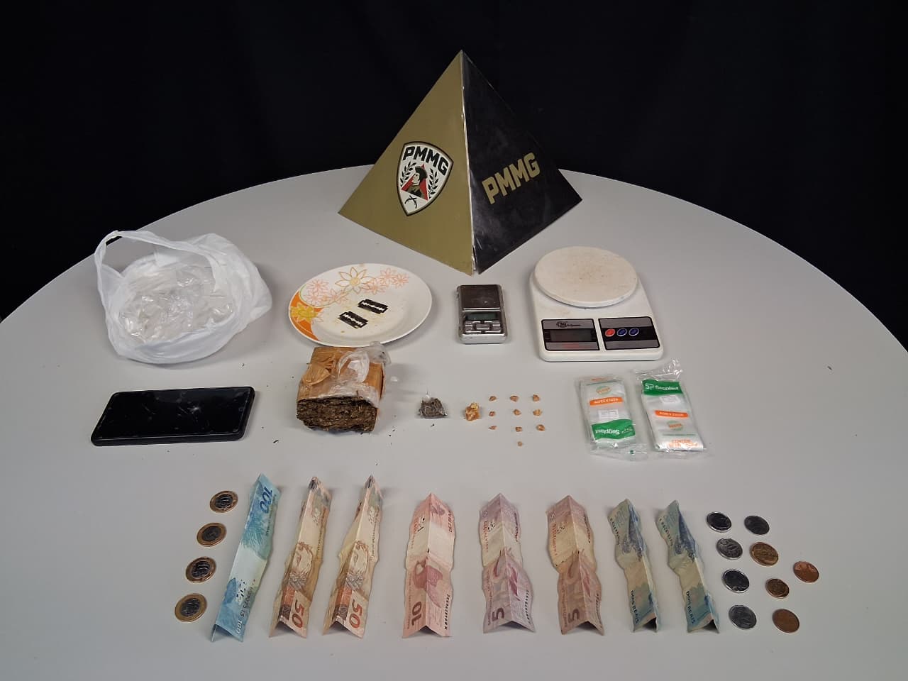 Também foram encontrados duas balanças de precisão, material utilizado para dolagem, R$ 130,95 em dinheiro e um telefone celular.