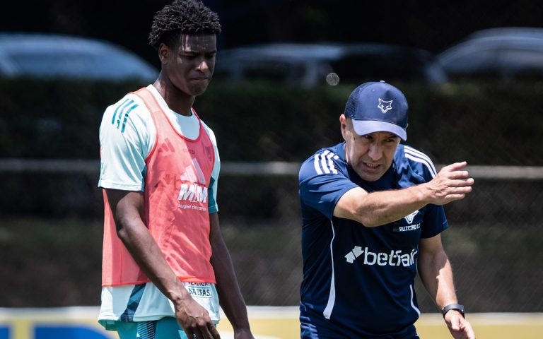 Leonardo Jardim e Jonathan Jesus durante treino na Toca da Raposa II. Foto: Gustavo Aleixo/Cruzeiro.